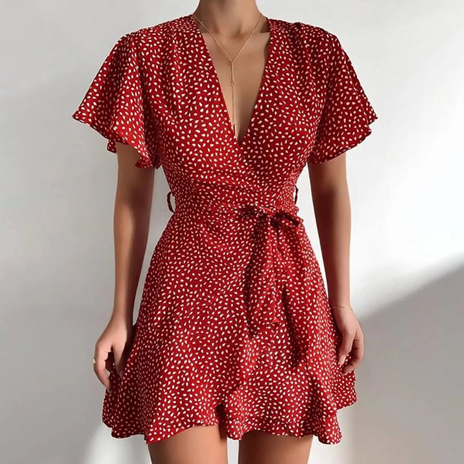 Womens V-neck Ruffled Waistband Wrapped With Printed Casual Dress